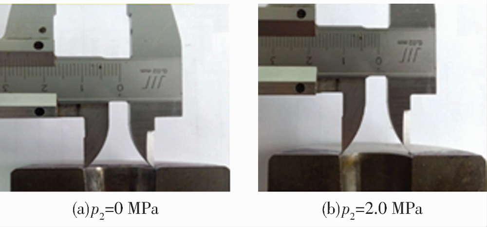 在上述無背壓的“穿膛過”磨粒流加工條件下,將加工后的工件線切割開,可以明顯看出進(jìn)出口處的尺寸d1,大于中間區(qū)域的尺寸d0,并形成“喇叭口”。出現(xiàn)該結(jié)果的主要原因是由于黏彈性磨料在出口處的突然擠入與釋放時形成的擠壓壓力過大,從而在工件兩端出現(xiàn)嚴(yán)重的過拋現(xiàn)象,嚴(yán)重影響空心滾子的尺寸。為避免“喇叭口”的形成,應(yīng)該控制進(jìn)出口的壓差,使磨粒流在加工過程中實現(xiàn)均勻的擠壓運(yùn)動。因此,在擠壓過程中對磨粒流施加一個回程壓力,即背壓P2與“穿膛過”式(背壓P2為零)的情況相比,在擠壓過程中增加磨料流回程壓力,可以降低壓力在進(jìn)出口處的突變,實現(xiàn)進(jìn)出口處壓力的小壓差調(diào)節(jié),從而有效抑制“喇叭口”的形成,其原理如圖6所示。