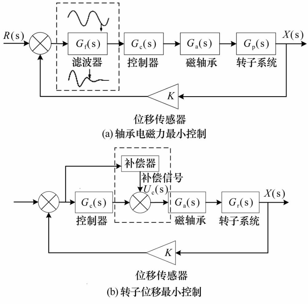 軸承電磁力最小算法與轉(zhuǎn)子位移最小算法是2種完全相對的控制方法,各有優(yōu)勢,也各有缺陷。軸承電磁力最小控制算法存在低轉(zhuǎn)速時(shí)閉環(huán)系統(tǒng)不穩(wěn)定的問題,轉(zhuǎn)子位移最小算法雖然能夠?qū)崿F(xiàn)轉(zhuǎn)子的高精度旋轉(zhuǎn),但在高轉(zhuǎn)速工況下容易致使功放飽和且放大轉(zhuǎn)子振動相位與不平衡力的相位差,通常適用于轉(zhuǎn)速較低的情況。對于2種算法的切換控制,有一些學(xué)者展開了研究:文獻(xiàn)[42]利用廣義根軌跡分析了引入補(bǔ)償后系統(tǒng)的閉環(huán)穩(wěn)定性,通過切換引入補(bǔ)償?shù)臉O性穿越臨界轉(zhuǎn)頻,從而實(shí)現(xiàn)引入LMS反饋補(bǔ)償后全轉(zhuǎn)速閉環(huán)穩(wěn)定;文獻(xiàn)[43]提出了一種新型多諧振控制器,可在不同轉(zhuǎn)速下實(shí)行分段切換策略,實(shí)現(xiàn)抑制基波和諧波電流;文獻(xiàn)[44]則提出了基于極性切換陷波器的方法。