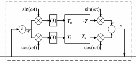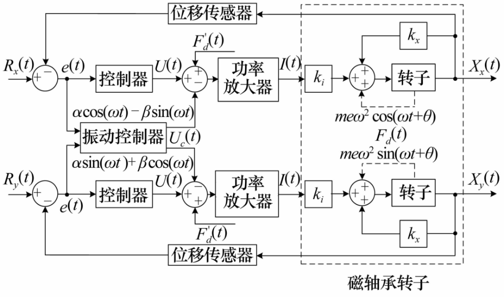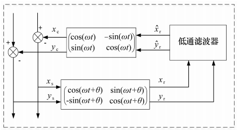 2015年,文獻(xiàn)[18]將電動機(jī)傳動控制中同步旋轉(zhuǎn)坐標(biāo)系(Synchronous Rotating Frame,SRF)變換的方法應(yīng)用于磁軸承系統(tǒng),其控制原理如圖7所示,相當(dāng)于一種新型的陷波濾波器,通過與控制器串聯(lián)工作在轉(zhuǎn)子低速旋轉(zhuǎn)時(shí)有良好的同步抑振性能。