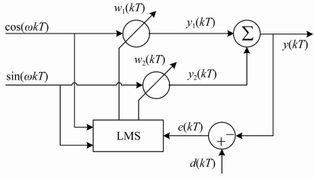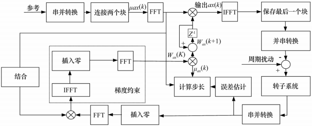 文獻(xiàn)[26]提出了一種基于頻域自適應(yīng)的LMS算法,單一通道不平衡振動自適應(yīng)控制框圖如圖14所示,其以諧波振動作為輸入,參考輸入為引入的與傳感器跳動具有相同分量的正弦信號,仿真結(jié)果表明該方法能有效提取磁懸浮轉(zhuǎn)子不平衡同頻振動信號。