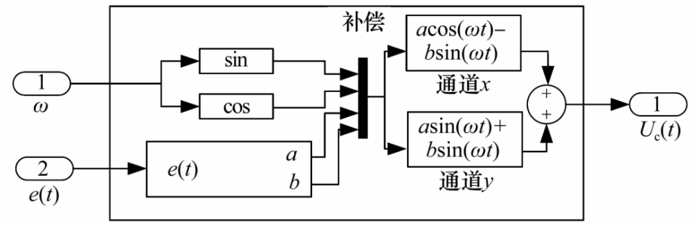 文獻(xiàn)[37]提出了一種尋找不平衡質(zhì)量位置的算法,通過如圖13所示的補(bǔ)償模塊將轉(zhuǎn)子轉(zhuǎn)速作為輸入,根據(jù)實(shí)時(shí)提取的轉(zhuǎn)子不平衡質(zhì)量的大小和位置產(chǎn)生相應(yīng)的控制信號,從而抑制不平衡振動。由于該不平衡質(zhì)量與轉(zhuǎn)子轉(zhuǎn)速無關(guān),該算法也適用于變速轉(zhuǎn)子。