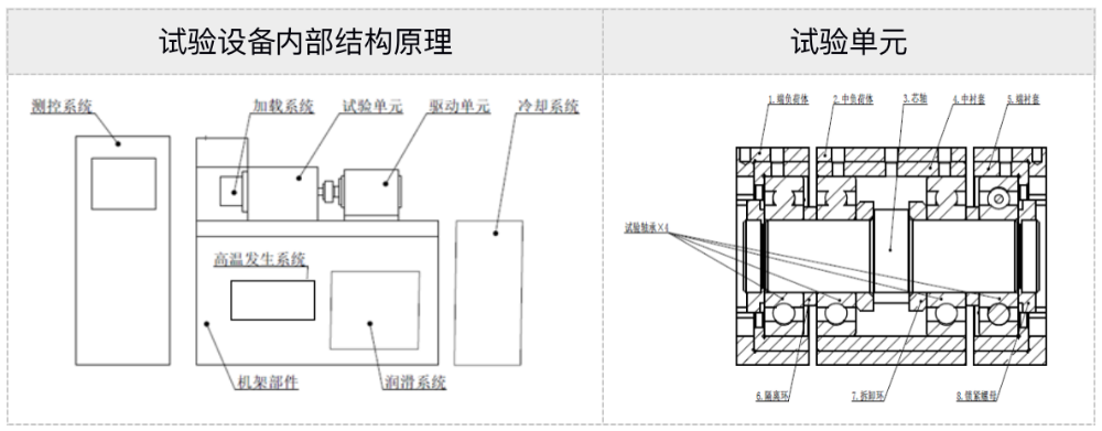 試驗(yàn)機(jī)結(jié)構(gòu)原理圖,包含機(jī)架部件、試驗(yàn)單元、驅(qū)動(dòng)系統(tǒng)、徑向加載系統(tǒng)、軸向加載系統(tǒng)、潤滑系統(tǒng)、冷卻系統(tǒng)、高溫發(fā)生系統(tǒng)、測控系統(tǒng)等部件組成。