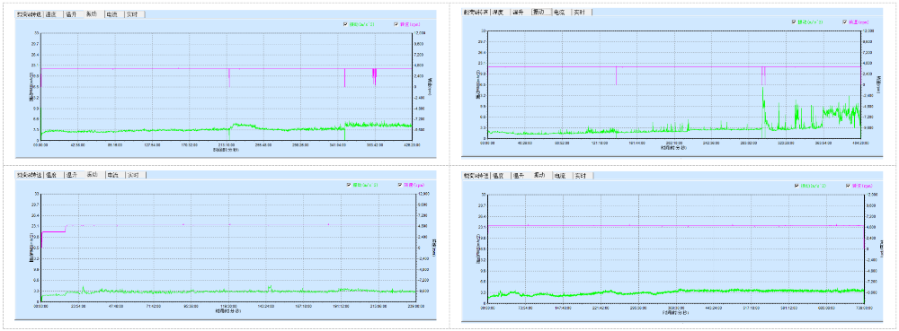對整個(gè)試驗(yàn)工裝的振動(dòng)情況進(jìn)行記錄,對每一時(shí)刻的振動(dòng)值進(jìn)行記錄,在整個(gè)測試中的振動(dòng)趨勢變化可以全程跟蹤軸承的狀態(tài),是否出現(xiàn)異常以及異常的趨勢變化,分析軸承在測試中哪一階段開始出現(xiàn)異常,是否出現(xiàn)打滑等狀況;