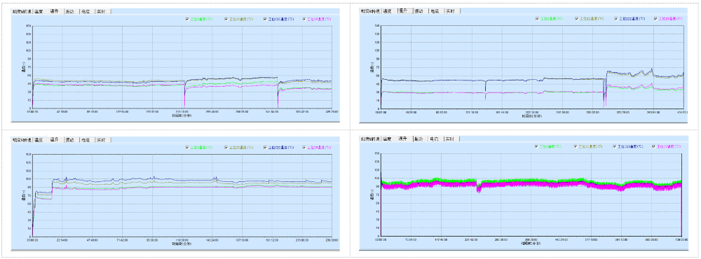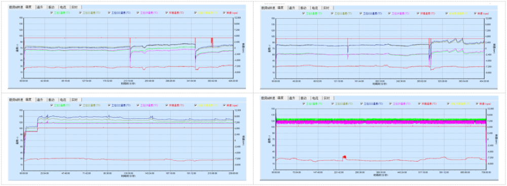 在測試中,對每套軸承的溫度、溫升進(jìn)行逐一監(jiān)控,進(jìn)行詳細(xì)記錄每套軸承在每個(gè)時(shí)間點(diǎn)的溫度狀況,對整個(gè)測試的溫度變化形成趨勢,是否形成異常高溫等;